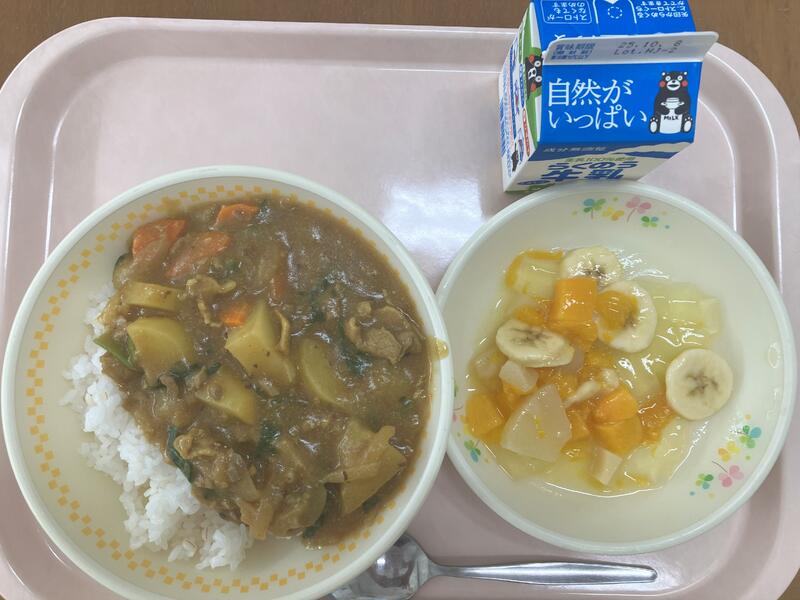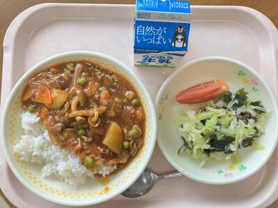 今月の献立テーマは「目にいい物を食べて、目を元気にしよう」です。今日は、目を元気にしてキラキラなひとみになるように、とりにく、チーズ、かぼちゃ、ほうれんそう、トマト、レーズンを加えたカレーです。かぼちゃは、白水小の畑でとれたものを使いました。カレーを盛り付けたら仕上げにトッピングのゆで卵をのせてください。ここでポイントなのが、「たまごをどのように置くか」です。卵を目に見立てて、顔を作ってみてくださいね。卵も目をキラキラ元気にしてくれる食べものです。目を元気にしてくれる食べものを覚えながら楽しく食べてくださいね。