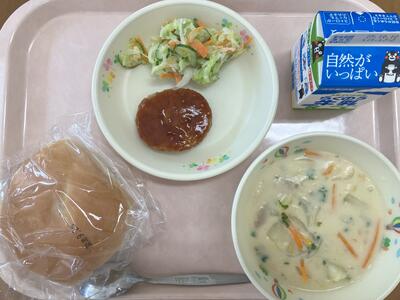 いよいよ明日は運動会ですね。最後の練習を終えて給食を食べている頃でしょうか。今日は、疲れた体を早く元気にして、楽しく食べられるように、自分で作るセルフハンバーガーにしました。パンにハンバーグとコールスローのサラダを挟んで、がぶっと食べてくださいね。疲れた体を回復させるためには、あか、き、みどりの食べものをバランス良くたべることが大切です。はさんで食べるハンバーガーなら、楽しく栄養バランス良く食べてもらえると思います。午後からの準備もがんばって、明日は練習の成果が十分発揮できるよう、給食センターからも応援しています