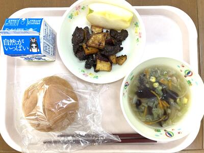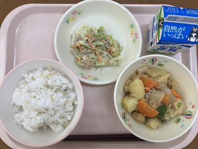 今月のふるさとくまさんデーは、山鹿の味です。山鹿地区は、熊本県の北に位置しており、菊池川周辺の平野では、おいしいお米がとれ、それを利用して作る酒蔵やせんべいなどの米菓子、麹屋などがたくさん発展してきた地域です。米以外にも野菜はもちろん、山手では斜面を利用してみかんが栽培され、その他ぶどうやスイカも多く生産されています。つなひきよいしょは、山鹿に伝わる民話から誕生した給食メニューです。大豆を食べて育った山と小豆を食べて育った山がつなひきをしたら、大豆を食べた山が勝ちました。そのくらい大豆にはかみごたえと栄養があるということです。また今日のサラダのかぼちゃは、中松の嶋津さんが育てられたものですよ