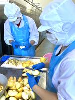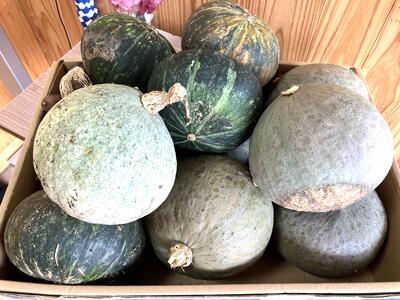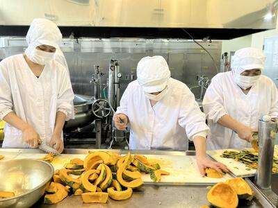 今日は、長陽の椛嶌農園さんのかぼちゃとじゃがいもを使っています。椛嶌さんは、化学肥料や農薬を使わず、自然の力で育てる、有機農業で野菜を育てていらっしゃいます。そのため、栄養いっぱいの畑になるように、たい肥を入れて土を作り、草取りもし、たくさんの手間ひまをかけて育てていらっしゃいます。実はこれは一昔前まではふつうにやっていた農業の方法でした。そんな大自然の中で、自然の力で育ったかぼちゃとじゃがいもを味わってくださいね。かぼちゃは雪化粧という甘みのある品種だそうですよ。