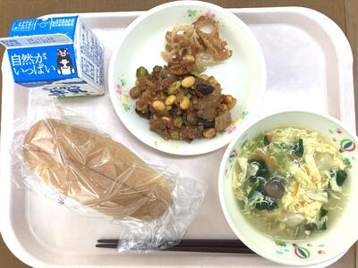 今日は、本校で、学校給食・食育研究発表授業がありました。3年生が学習してきた南阿蘇のおいしい食材「米、あか牛」と、5年生が学習しているだしとして「かつおだし」のかき玉汁を作り、授業に関するコラボメニューでした。