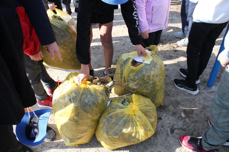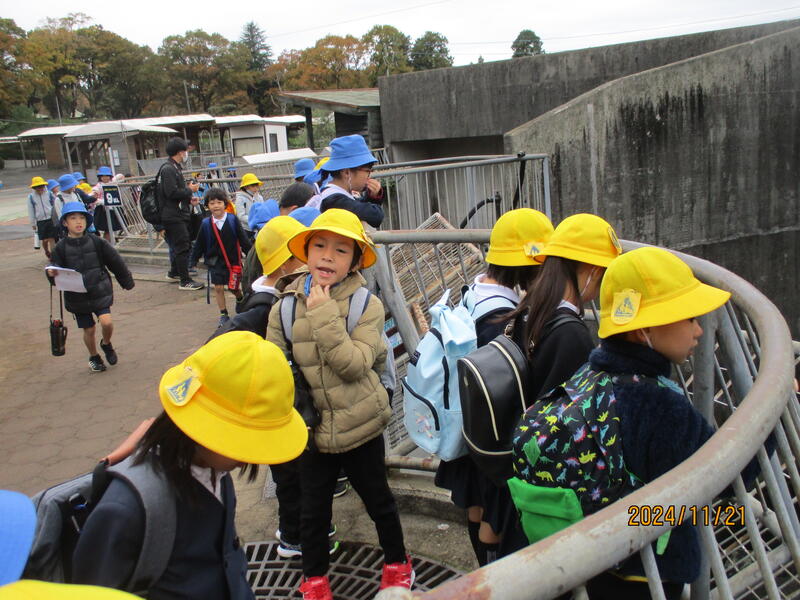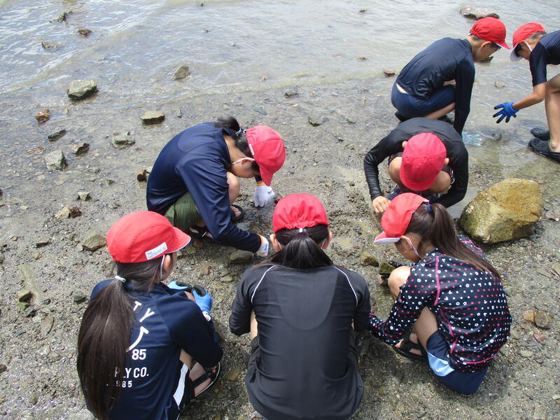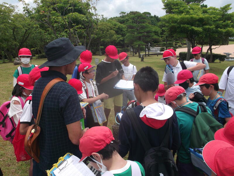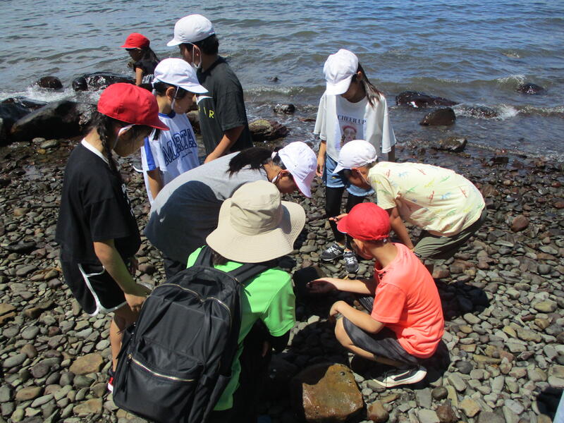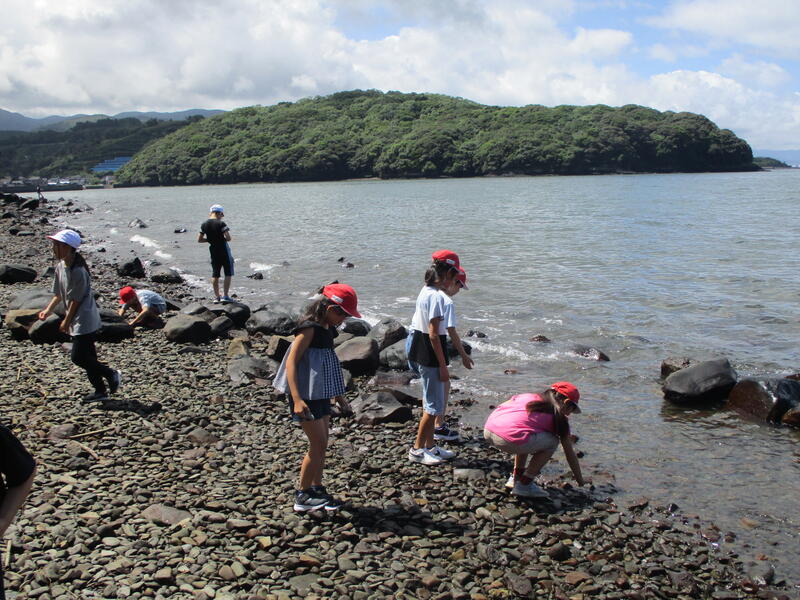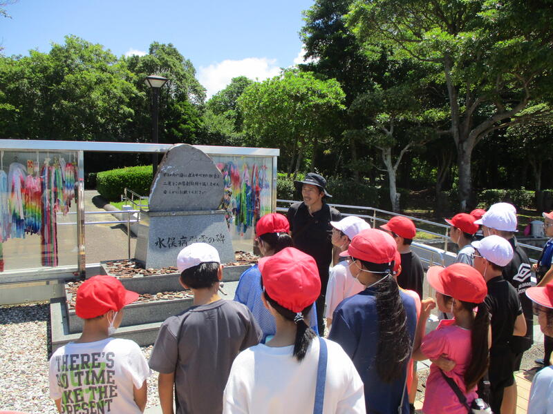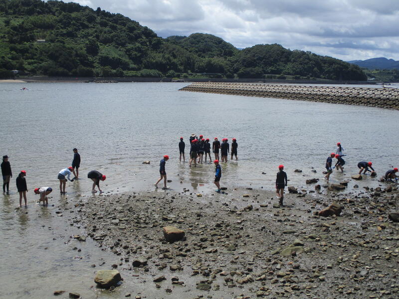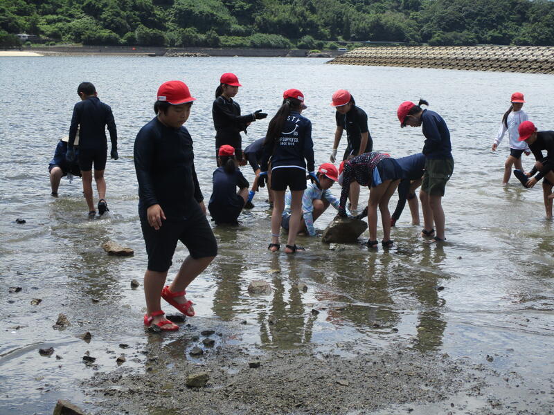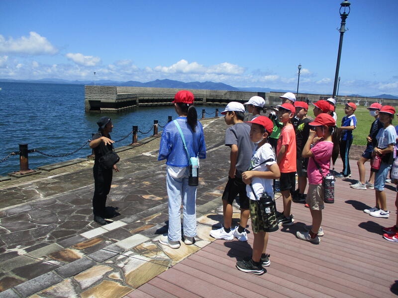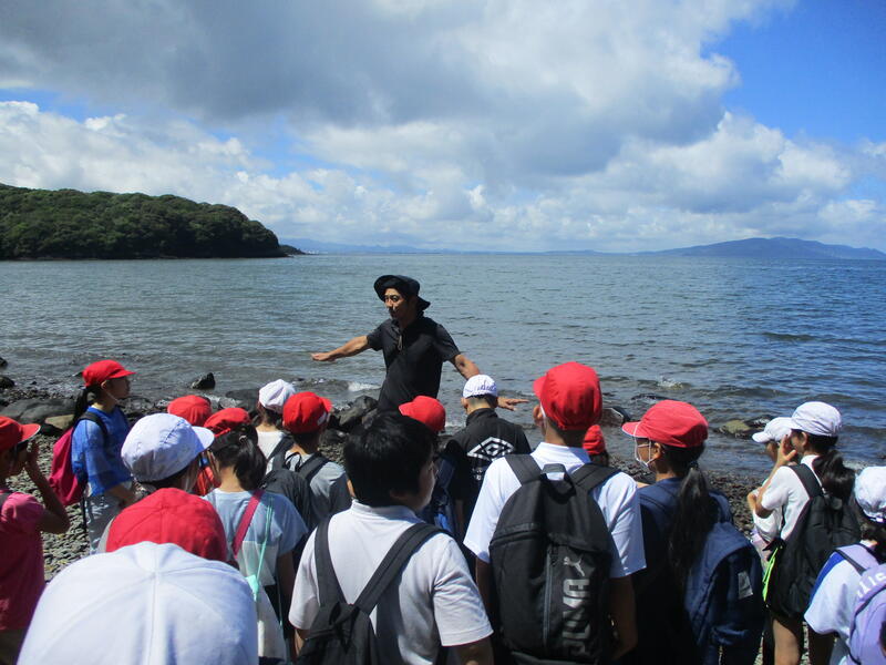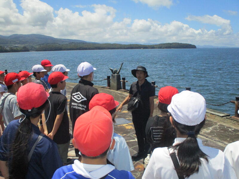 今日は現地学習中心です。現地で語り部さんからお話をしていただき、実際に海で遊んできました。とてもきれいな海でした。その後、親水護岸・百間排水口を見学しました。事前学習したことをもとに、実際に話を聴き、自分の目で見て、さらに学習が深まりました。