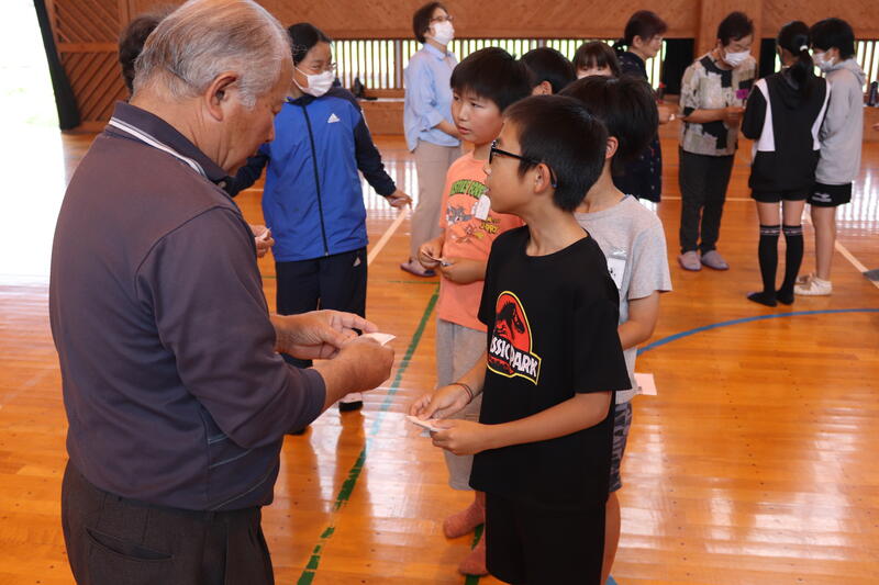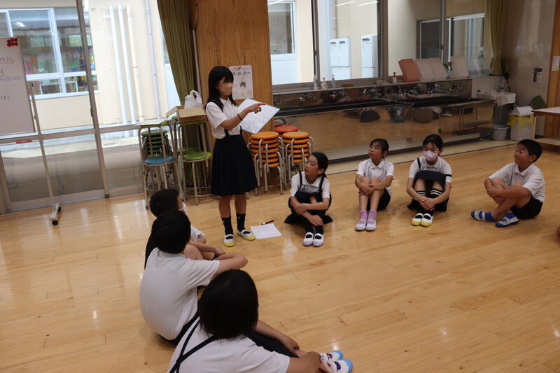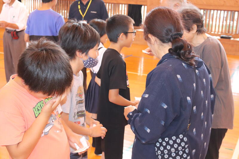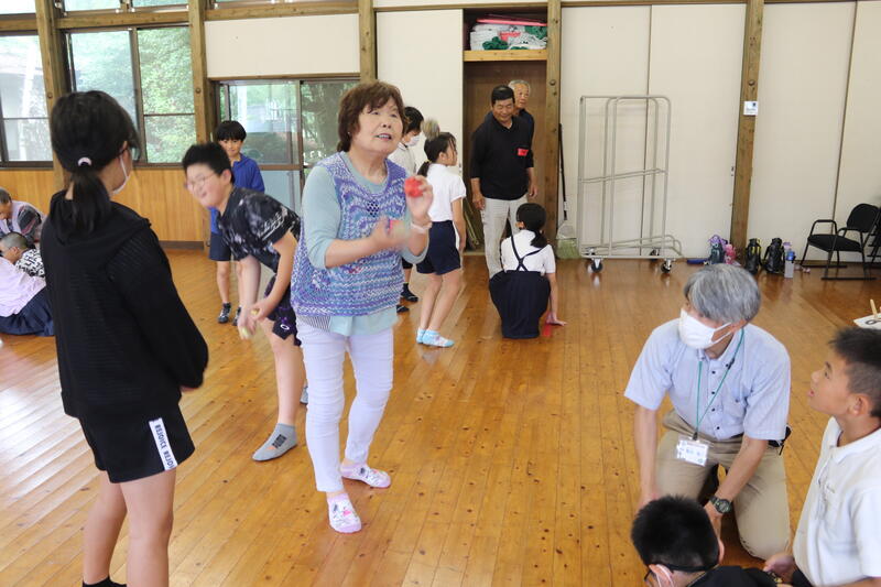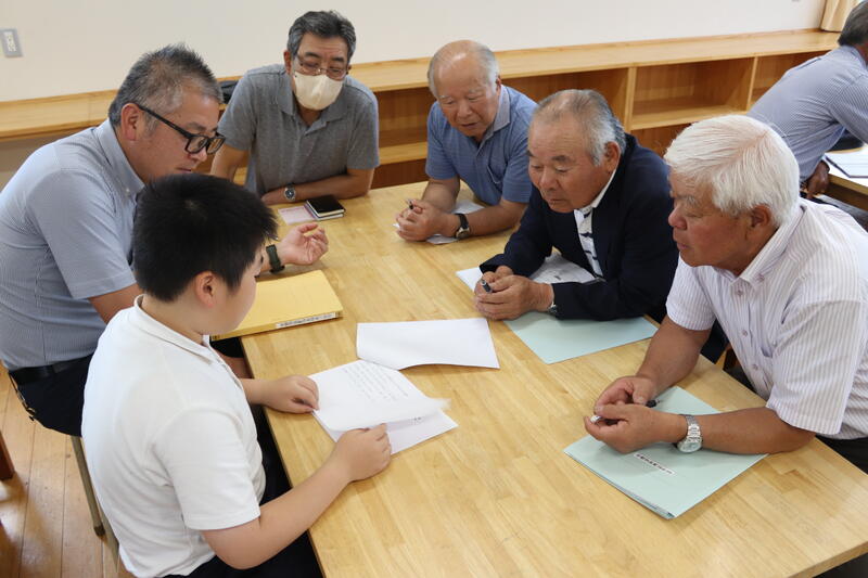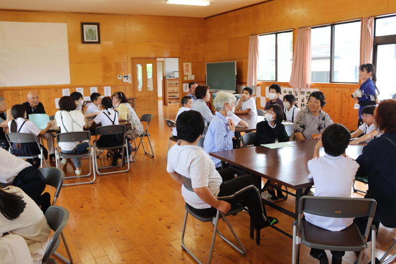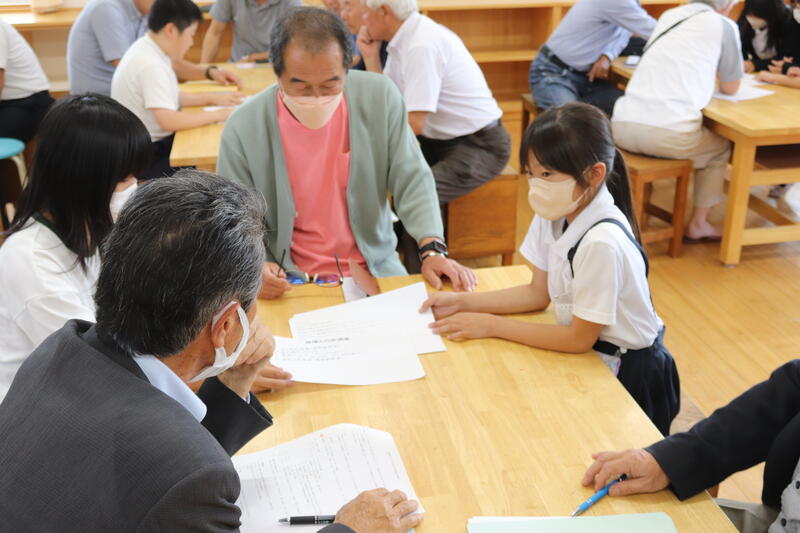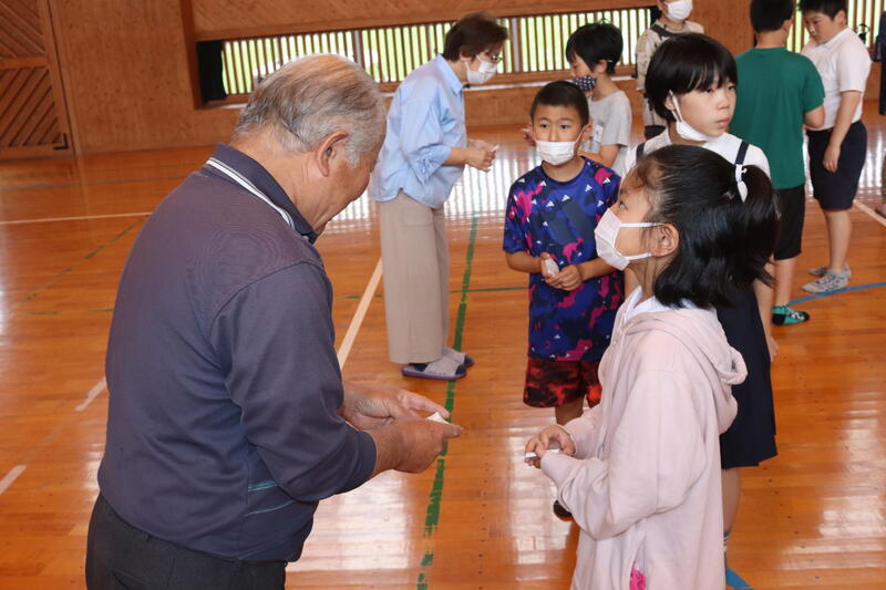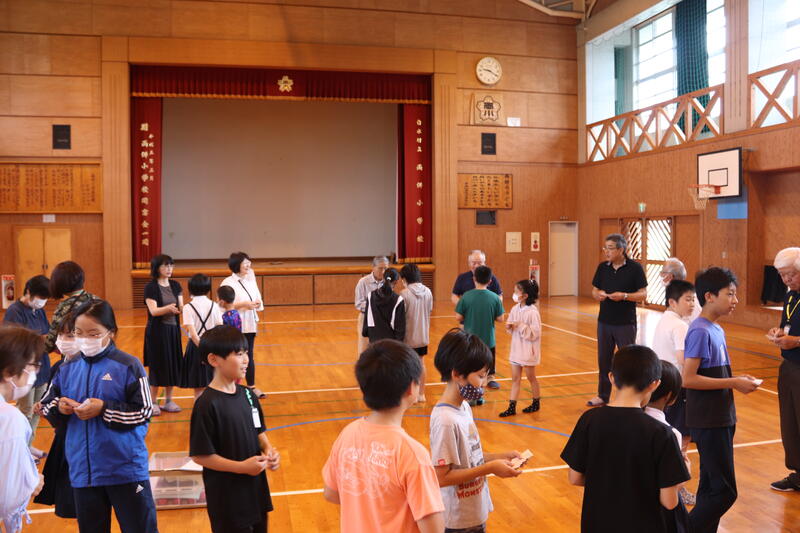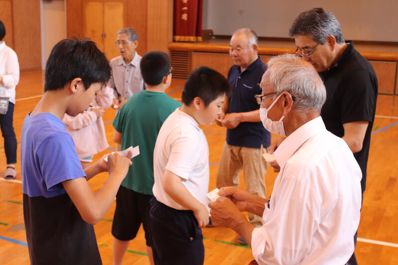 昨年度の2月の学校運営協議会で、本校児童(企画運営委員会)から、「地域の方々と交流する機会を作りたい」と提案がありました。学校運営協議会の委員さん方のご協力をいただき、校区内の各区長さん方との打合せ会を経て、7月11日、ついに第1回目の「地域との交流会」を実施することができました。今後は、「地域の特色を生かした活動」として、本校の伝統になるよう取り組んでいきたいと思います。
