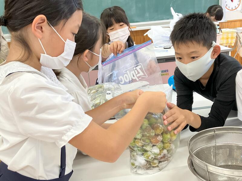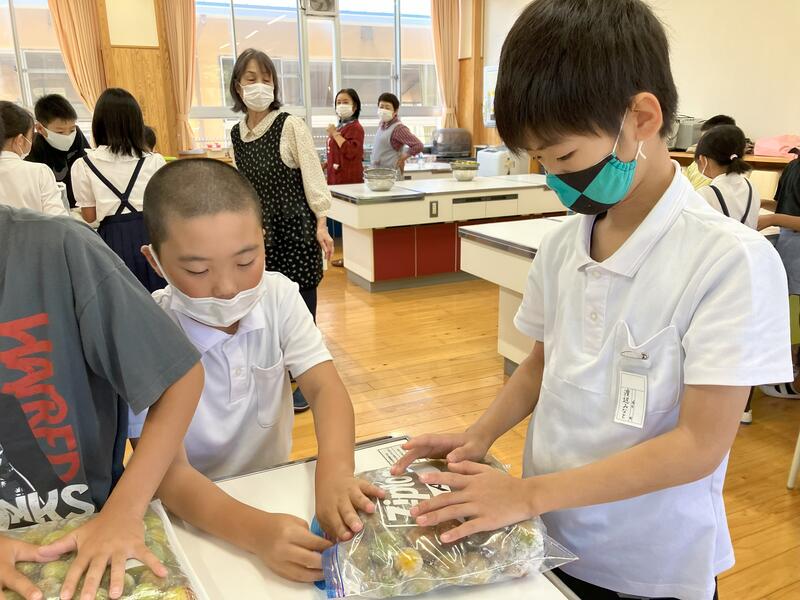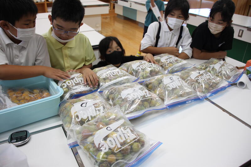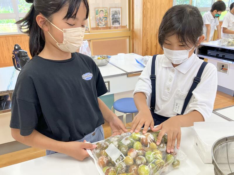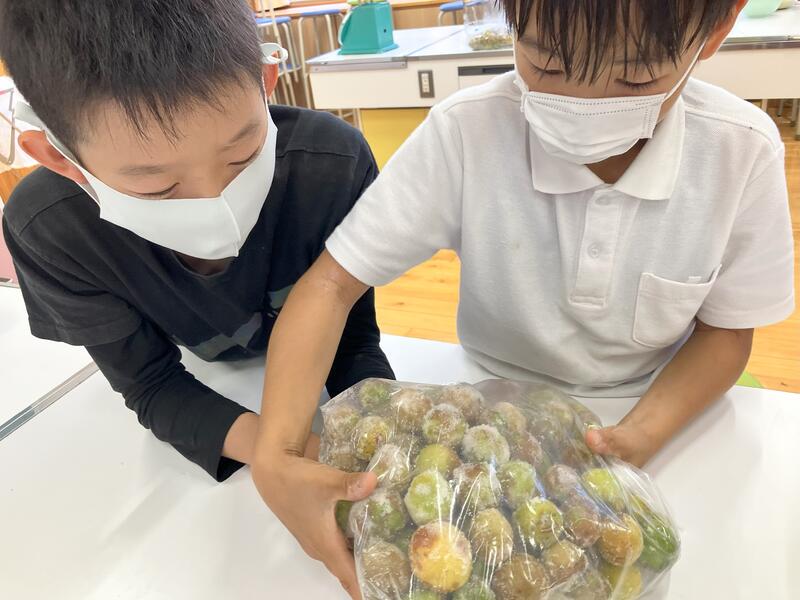 去年、4年生で梅ちぎりをし、婦人会のみなさんの協力のもと、梅干し作りをたいけんしたました。