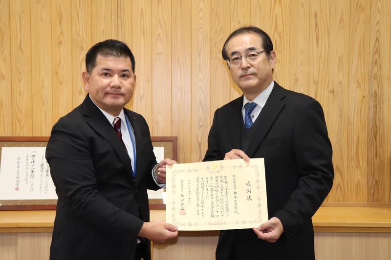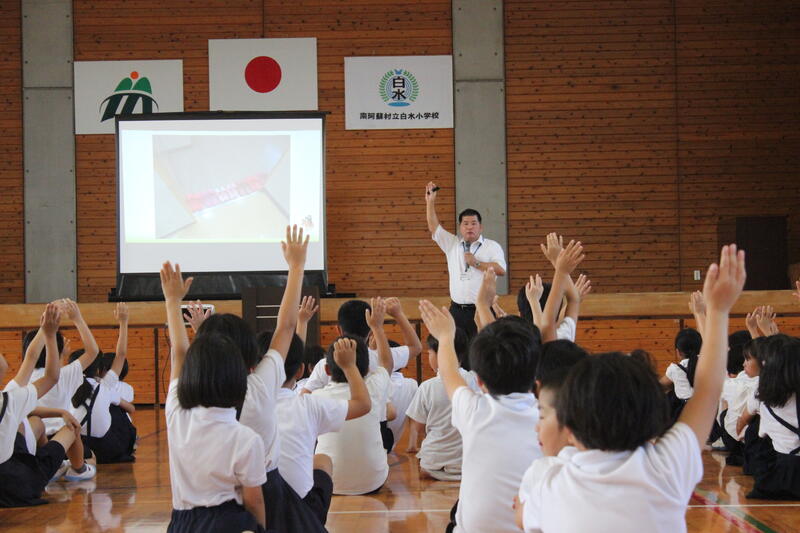 こどもの日を前に、南阿蘇村の民生委員・児童委員の皆様から、白水小学校の全校児童に「折り紙のカブト」のプレゼントがありました。全て民生委員・児童委員さん方の手作りで、しかもひとつひとつにメッセージが書いてありました。各学年の代表児童に渡される際に、「健康で楽しい毎日を過ごしてください」とのお言葉もいただきました。