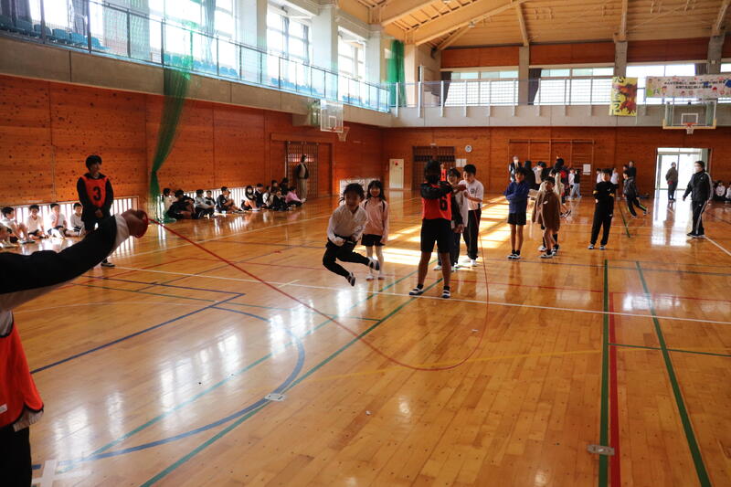 ボールを持っている人がおにになり、みんなアリーナいっぱいに走り回りました。