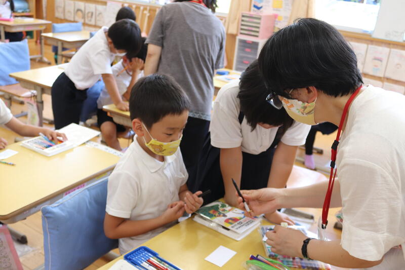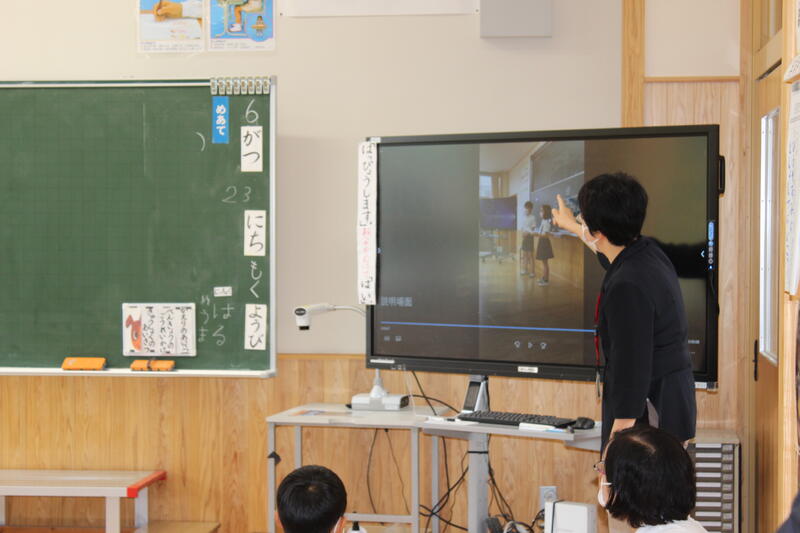 1年生は、江藤先生・吉峰先生の学級活動でした。係活動を決める活動です。江藤先生が事前に6年生の話合いの様子を動画で撮影し、それを見せることで、話合いのイメージを持たせていました。そして、その後、自分たちで話し合って係を決めていました。1年生で話し合って、何かを決めるということは難しいことですが、子どもたちが一生懸命取り組んでいました。