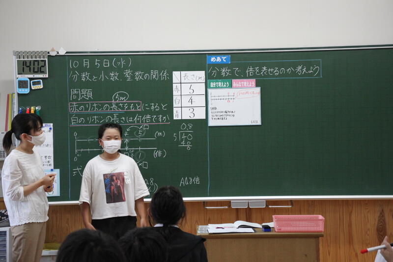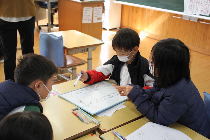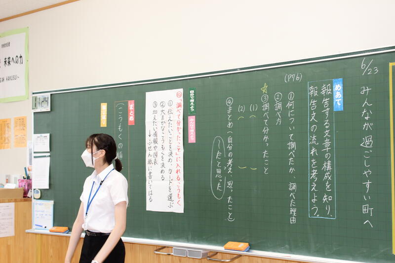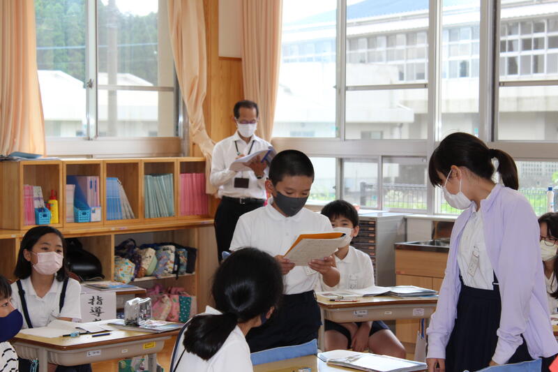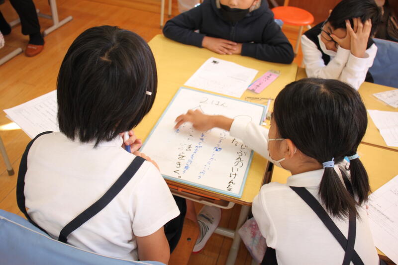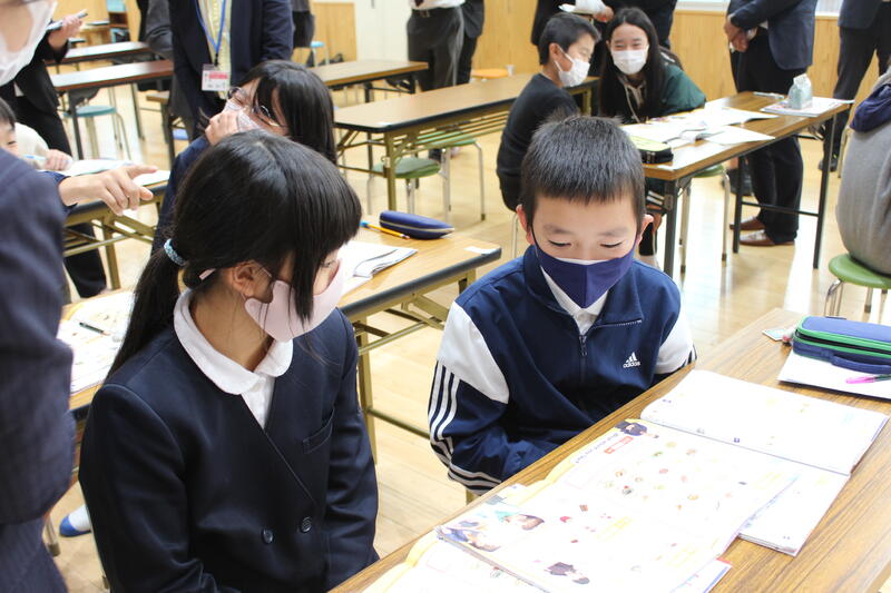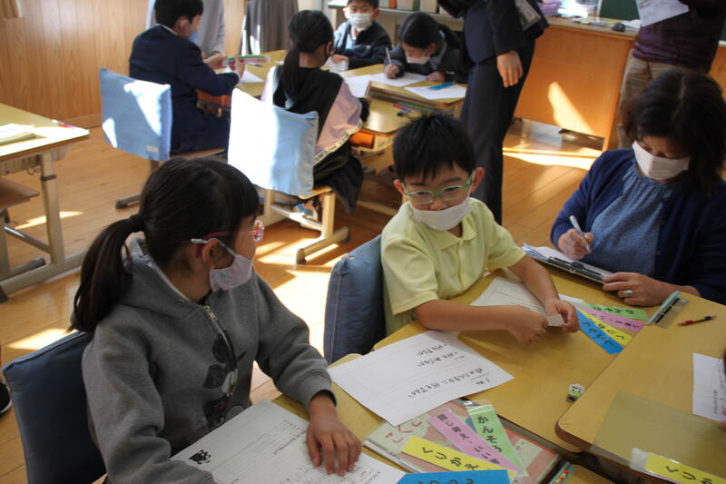 5年2組の脇先生の国語は、住みよい町にする報告文を作るための構成を考える学習でした。事前に調べた内容を分かりやすく、より伝わるようにするためには、どのような報告文の組み立てをすればよいのかをみんなでアドバイスし合いながら考えました。カードや付箋紙を使って話し合いを進める点で工夫されていました。