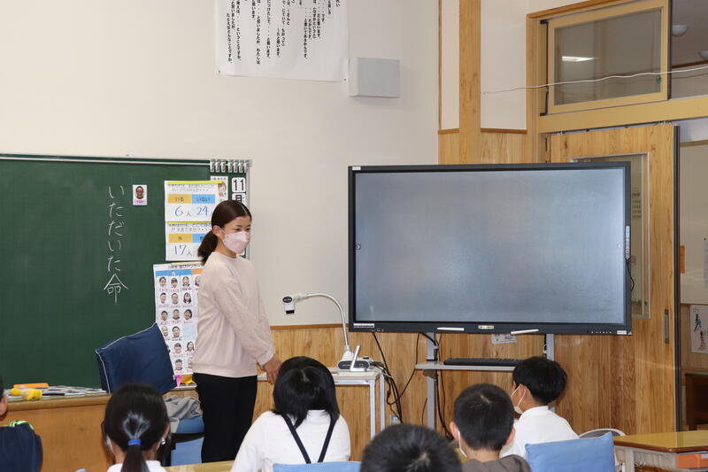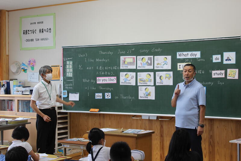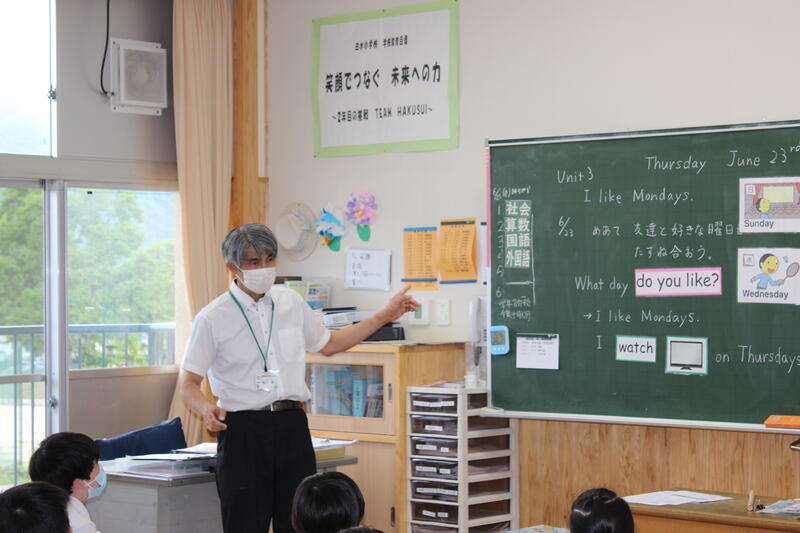 4年生の荒川先生・都甲先生の外国語科は、好きな曜日について尋ね合う学習でした。好きな曜日にその理由を付け加えて話すことが主な学習でした。「What day do you like?」をみんなで言いながら好きな曜日を答えていました。聞き方や答え方もですが、話したい、話そうとする気持ちや意欲も持てるといいですね。楽しそうな授業でした。
