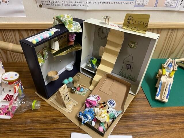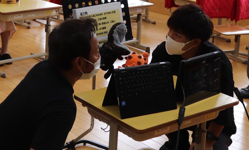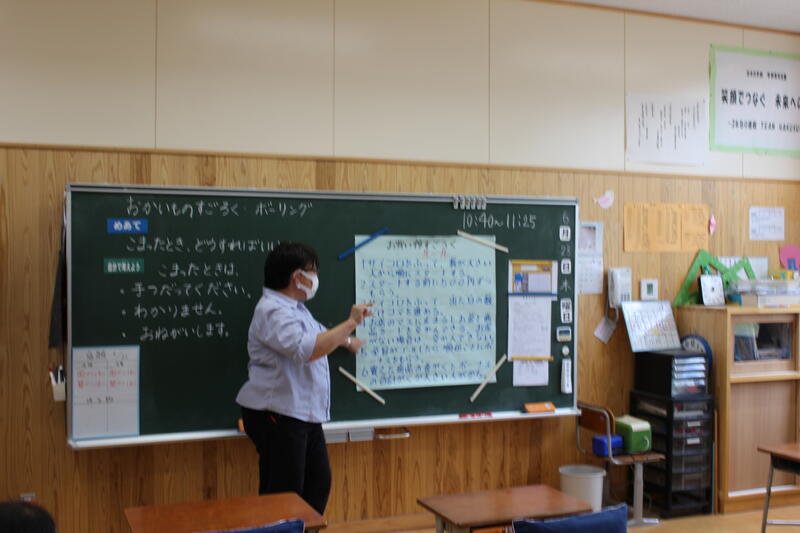 コスモス3組の遠山先生・小井手先生は自立活動で、ルールを守るということを目標した学習です。様々な教具を使って、想定される場面で、どのような行動をとればよいのかを、みんなで考えました。子どもたちも自分なりに、自分の行動を振り返り、次はどのようにすればよいかを考えることができたようです。