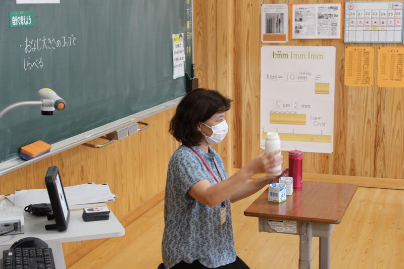 2年生もコスモス2組も同じ内容で学習しました。「かさ」の学習です。2年生の東先生の授業もコスモス2組の岩切先生の授業も、かさを比べるときにはどうすればいいのかということを考えました。おなじ道具を使って比べることの必要性と普遍単位につなげる学習でした。操作活動も多く、時間もかかりますが、実際に経験することが量感を養うことにもつながります。大切な学習です。dlやlにつなげていきます。