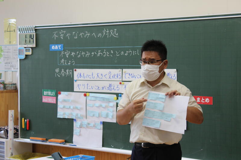 5年1組で行いました。心の発達と体とのつながりについて考える学習です。同時に不安や悩みも増えてくることだと思います。その不安や悩みを軽くするための方法をみんなで出し合いました。これから不安や悩みもあると思いますが、今回の学習で自分に合った方法を見つけ、学習の成果が生かせればいいなと思います。