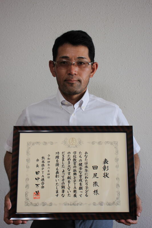 6月4日に熊本県PTA連合会総会にて、昨年度会長の田尻徹さんがこれまでのPTA活動の功績を称え、表彰されました。この表彰は、田尻さんが、白水小学校PTAのみならず、前中松小学校や阿蘇郡市のPTAの活動や取組をされてきたことが評価されたものです。ここで、田尻会長が企画された昨年度のPTA活動の中から厳選した取組を紹介します。