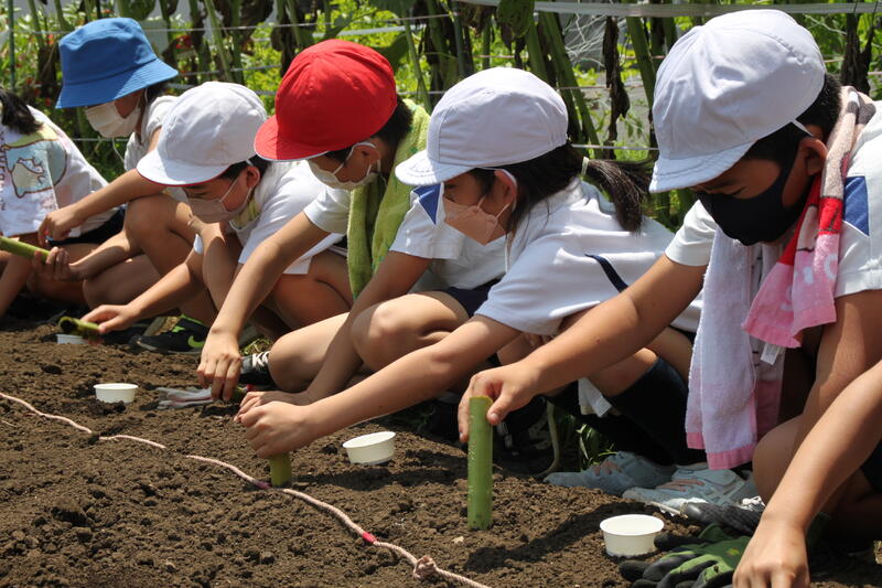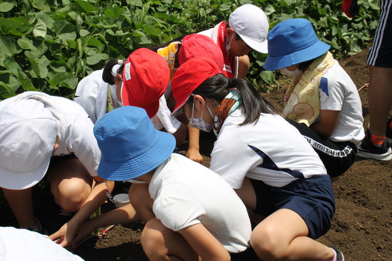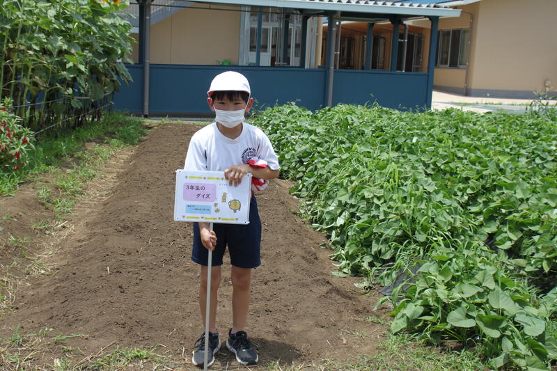 昨年度、1・2年生(現2・3年生)が植えたさつまいもが・・・という事件がありました。ちょうど、今の時期でした。今年もたくさんの作物が植えてあります。すでに収穫したものもありますが、すくすく育っているものあります。さつまいももまだ無事です。秋の収穫までなんとか・・・と思っています。