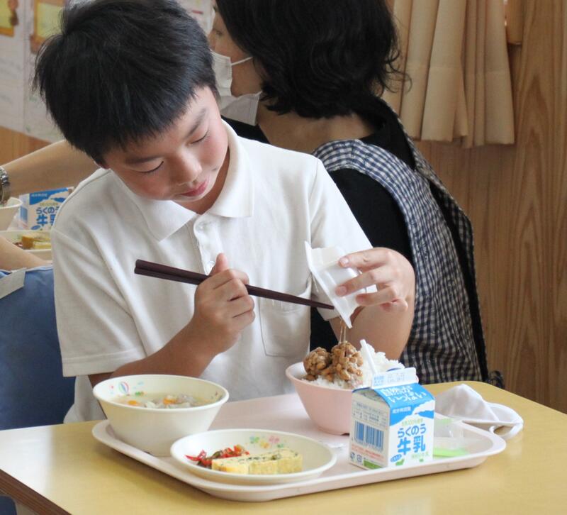 3年生は、以前にもこのブログでお知らせした大豆の栽培を行っています。それにともなって、本校は丸美屋さんから支援を受けて大豆の学習や納豆の贈呈をしていただきました。その贈呈式で6年生が代表でもらい、その後、3年生の食べている様子を紹介します。