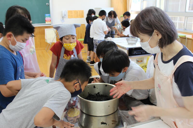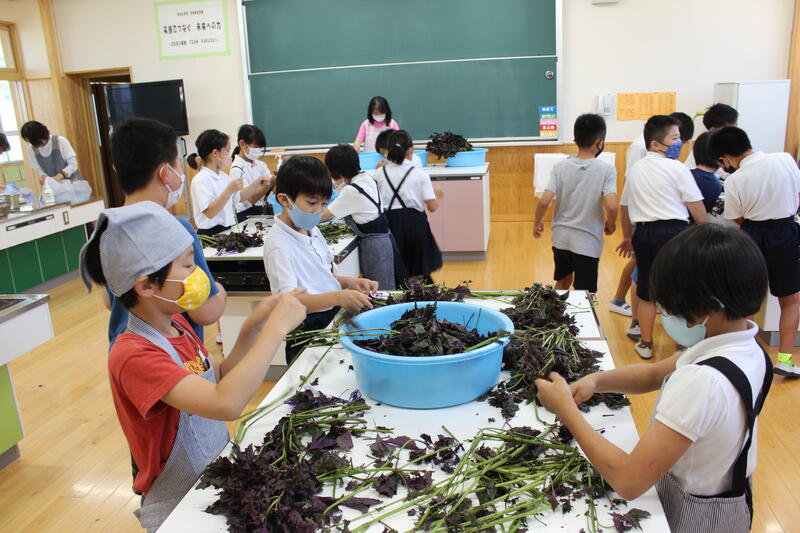 今回は4年生です。4年生は、6月に梅ちぎりを行いましたが、その梅を使って梅干し作りを行いました。紫蘇をふんだんに使って、梅干し作りです。初めてした子や作っているのを見たことがある子や様々ですが、いい経験となったようです。おいしい梅干しになるといいですね。