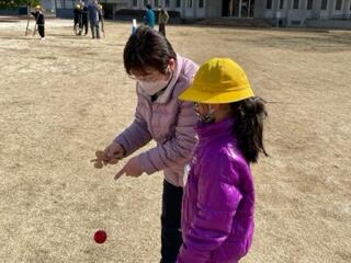 本日、晴天の中、1年生の昔遊びを地域の方と行いました。ビー玉、お手玉、竹馬、あやとり、お手玉、羽根つきの6つです。