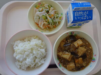 今日の給食は、「麦ごはん、牛乳、なす入りマーボー豆腐、こんにゃくサラダ」でした。