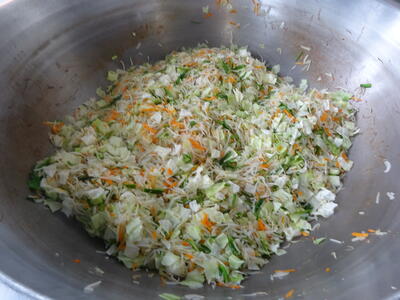 白菜とりんごのサラダは、蜜入りのりんごでした。野菜やドレッシングとなじむように、りんごは薄く切ってもらいました。おかげで、味だけでなく彩りも良く、季節のおいしいサラダになりました。