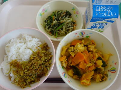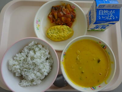 今日の献立は、「麦ごはん、牛乳、かぼちゃのそぼろ煮、ほうれん草のごま和え、かれーじゃこふりかけ」でした。