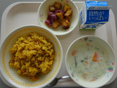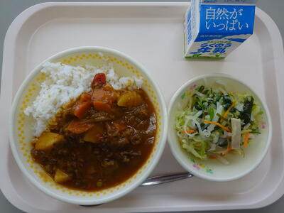 今日の給食は、「チキンカレー、牛乳、ヨーグルト和え」でした。この組み合わせは、子どもたちも先生たちにも、大人気でした!!