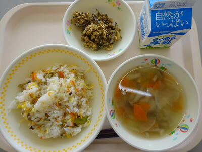今日の給食は、「ナシゴレン、牛乳、野菜スープ、ガドガド」でした。世界の味の旅で、『インドネシア共和国』の料理を出しました。給食では、子どもたちが食べやすいような味つけの工夫をしました。