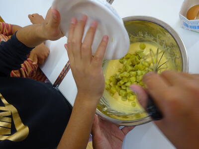 副菜の「さつまいもとりんごの重ね煮」は、『さつまいも、りんご、レーズン、砂糖、塩、シナモン、バター』を鍋に重ねて入れながら作りました。ベテランの調理員さんが、上手に作ってくださいました。しかし、子どもたちは、「シナモン、レーズンが苦手・・・、甘味が苦手・・・・」と、私が想像していたより苦戦していました。初めての献立を出す時は、量を少なくして出すといいのかぁと反省しました。また、次!チャレンジします!!