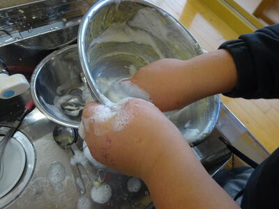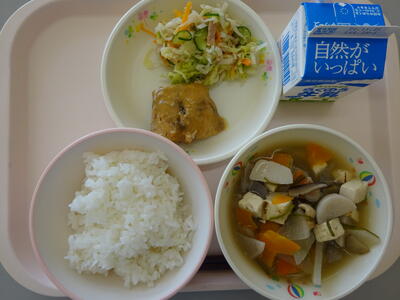 なめこのみそ汁は、赤みそと合わせみそで味を付けました。『なめこが好きだから、おいしかったです!』と言う感想があり、嬉しかったです。また、副菜の切り干し大根のうま煮は、大豆がアクセントにありました。御飯によく合う味つけで、子どもたちもしっかり食べていました。