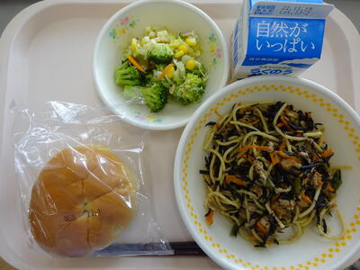 今日の献立は、「食パン、牛乳、ビーンズミートスパゲティ、大根サラダ」でした。