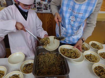 まめまめサラダは、ひじきに下味をつけてからサラダに入れました。こちらは、うどんと比べると少し苦手だったようです。給食では定番の『まめまめサラダ』です。ひじきの代わりに、ハム、ちりめんじゃこを入れるなど、中身を工夫しながら出しています。