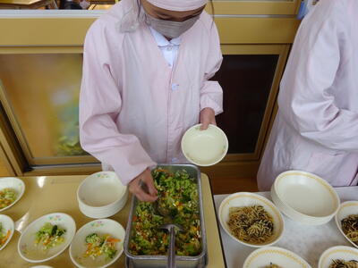 かみんこサラダは、さきいかのうま味、れんこんのシャキシャキ感を味わえたサラダでした。旬の小松菜を入れたのですが、小松菜特有の苦みと辛みがあり、苦手に感じた子どもたちもいました。給食センターの調理員さんと、「小松菜の代わりにきゅうりを入れると、子どもたちが食べやすいサラダになったね。」と言う話になりました。
