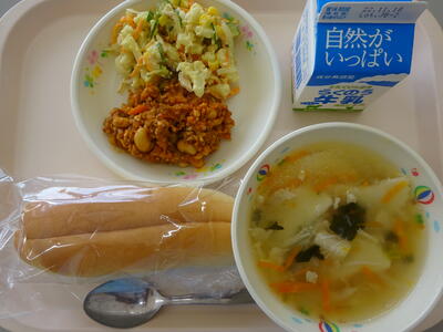 今日の給食は、「シャキシャキそぼろ丼、牛乳、わかめのみそ汁、ミックスかりんとう」でした。