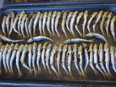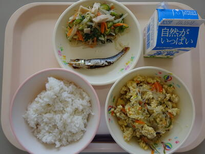 今日の給食は、「麦ごはん、牛乳、つみれ入りスープ、ししゃものカレー焼き、たまごと春雨のいためもの」です。ししゃものカレー焼きは、給食の定番メニューです。ししゃもに、オリーブオイル、おろしにんにく、カレー粉をまぶして、オーブンで焼きます。カレー粉の風味で、小魚も食べやすくなります。また、オーブンでカリッと焼くことで頭としっぽもしっかり食べることができます。