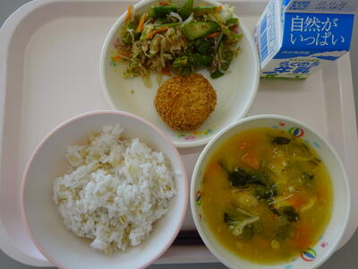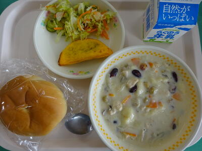 今日の給食は、「チキンライス、牛乳、キャベツのミルクスープ、きなこビーンズ」でした。