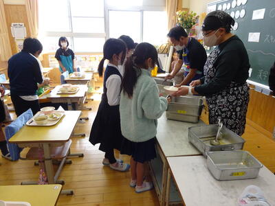 せんべい汁は、青森県八戸市周辺が発祥の郷土料理です。かたい南部せんべいを、調理員さんが小さく割って入れました。せんべいに、だし汁がしみ込み、もっちもち、トロッとした食感になりました。一口食べるたびに、体の中からポカポカと温まっていきました。給食のせんべい汁は、12月定番の一品になっています。せんべい汁が給食に登場すると、冬休みが近づいているなぁ~と感じる子どもたちもいるかもしれませんね。