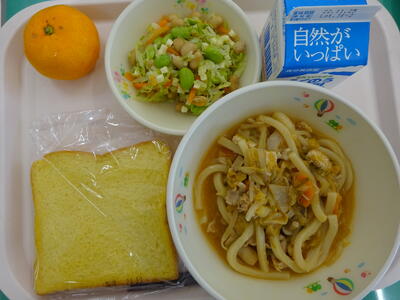 今日の献立は、「ミルクパン、牛乳、煮こみうどん、れんこんチップス、さつまいもとりんごの重ね煮」でした。