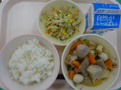 今日の献立は、「麦ごはん、牛乳、みそおでん、海藻サラダ」でした。