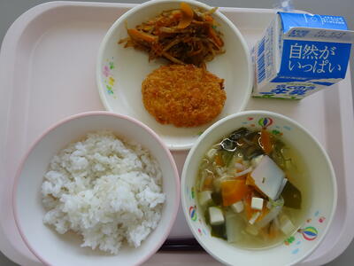 今日の給食は、「麦ごはん、牛乳、豆腐とわかめのすまし汁、牛肉コロッケ、洋風きんぴら」でした。牛肉コロッケがやわらかいので、噛みごたえのある「洋風きんぴら」を組み合わせました。