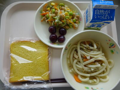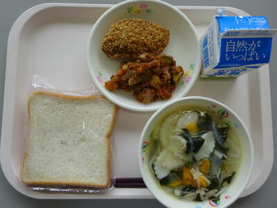 今日の給食は、「米粉パン、牛乳、野菜スープ、オムレツ、ぶどうゼリー」でした。