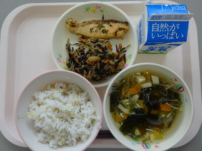 今日の給食は、「麦ごはん、牛乳、かぼちゃのみそ汁、魚のレモンづけ、ひじきとくるみのソテー」でした。
