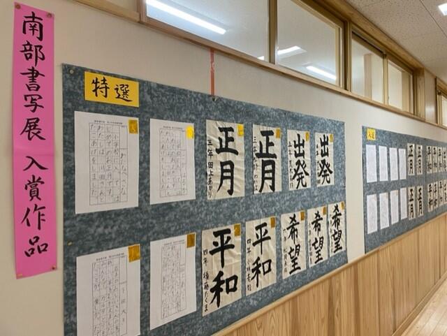 さて、学校集会では、先日行われた南部書写展の表彰を行いました。たくさんの児童が入賞し、今回は特選の児童のみの表彰を行いました。コロナ禍のため、校長室での表彰となりました。現在、作品は職員室前に掲示しております。機会があれば、ご覧ください。