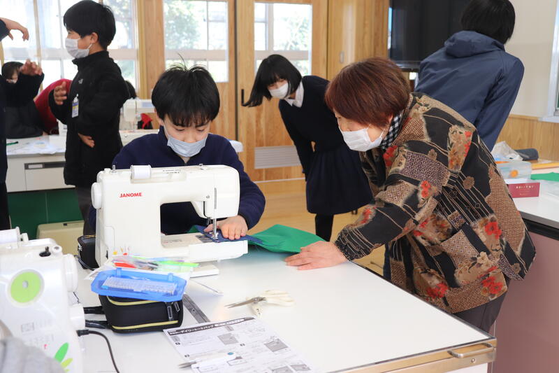5・6年生の家庭科でミシンの学習があります。ミシンを使ったことがある児童も少なく、かなり作業の時間がかかります。また、機械の操作も含めて難しいものです。そこで、地域学校協働活動推進員の吉里さんにお願いをし、婦人会の長尾会長のご紹介で、多くの地域の皆様にお手伝いをしていただくことになりました。