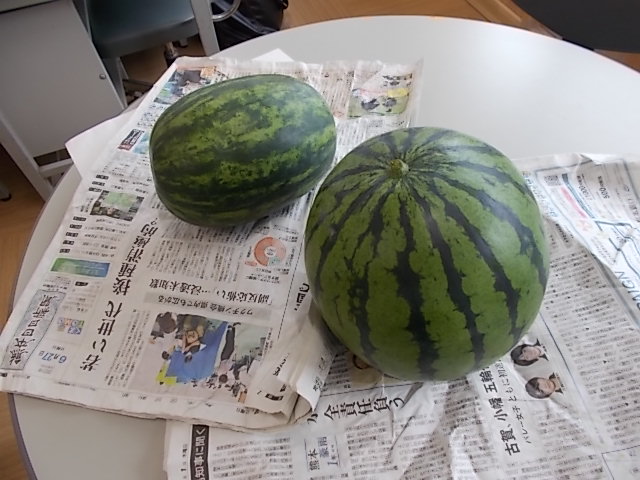 その中でも、今日は夏の風物詩「スイカ」を紹介します。本校の畑でできた「スイカ」です。立派な「スイカ」ができました。子どもたちが一生懸命育てたからでしょうね。大きな「スイカ」です。