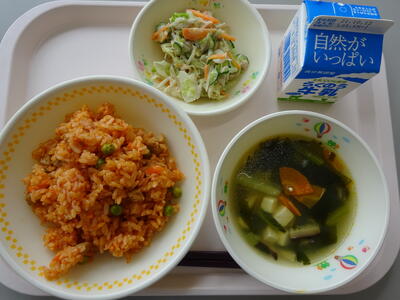 10月最初の給食は、「チキンライス、牛乳、わかめスープ、ごぼうサラダ」です。チキンライスは、教頭先生が大好きなメニューです!チキンライスを食べた感想は、「おなかいっぱい!!」でした。