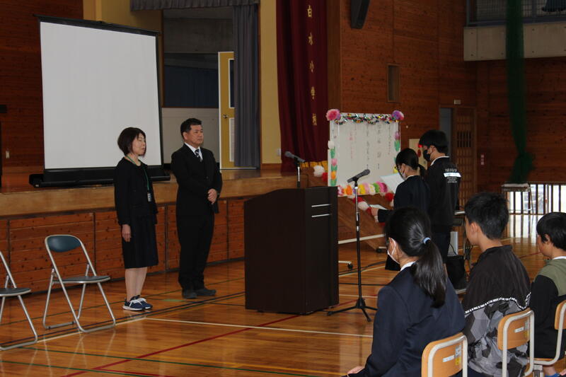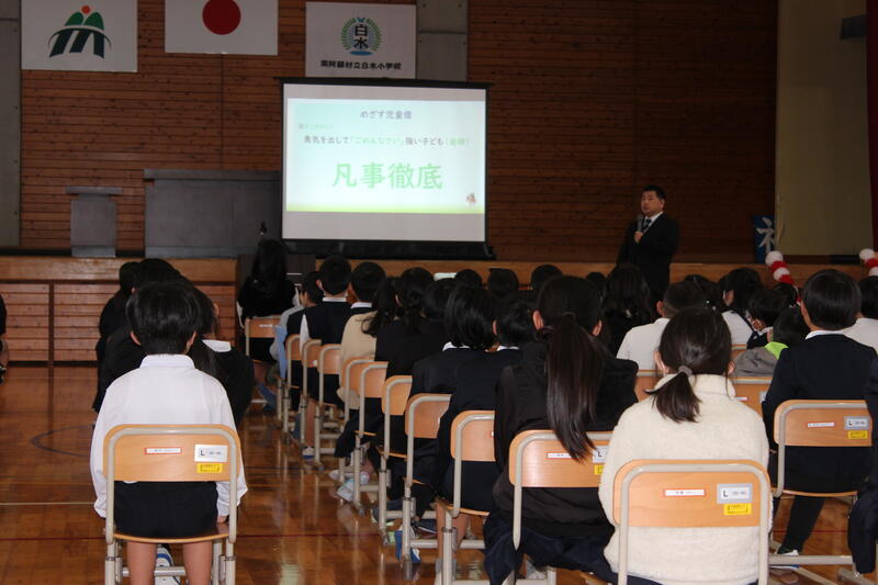 令和6年度は、新しくお二人の先生方をお迎えしました。就任式では児童代表が歓迎の言葉を発表しました。その後行われた始業式では、校長先生から「今年、白水小でがんばっていきたいこと」としてお話がありました。本年度は152名でスタートします。