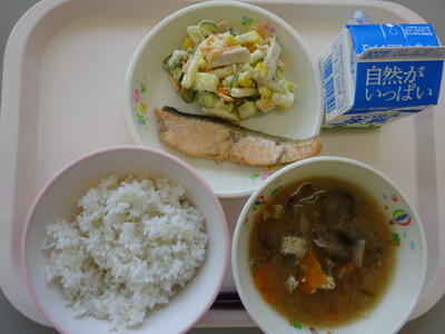 今日の給食は、「麦ごはん、牛乳、なすのみそ汁、鮭のバターしょうゆ焼き、マカロニサラダ」でした。
