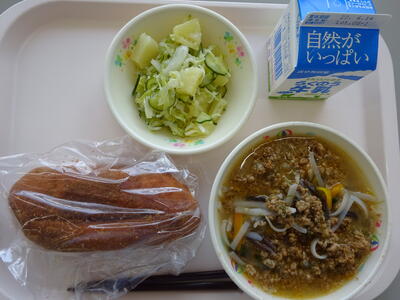 今日の給食は、「きなこ揚げパン、牛乳、肉みそ汁ビーフン、キャベツとパインのサラダ」でした。今日は、給食の残りは、ほとんどなかったです。