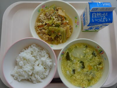 今日は「麦ごはん、牛乳、かきたま汁、キャベツと厚揚げのみそ炒め」でした、しっかり噛むために、野菜「キャベツ、にんじん、たけのこ、にら、しめじ」などを、たくさん取り入れました。