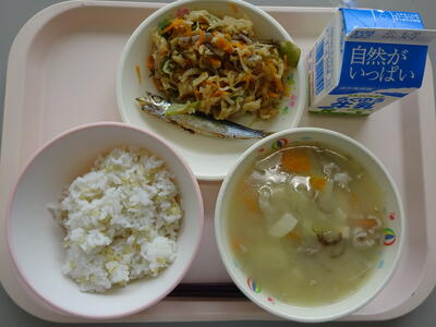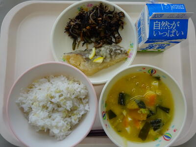 今日の給食は、「麦ごはん、牛乳、かぼちゃのみそ汁、魚のレモンづけ、ひじきとくるみのソテー」でした。