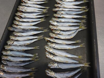 今日の給食は、「麦ごはん、牛乳、つみれ入りスープ、ししゃものカレー焼き、たまごと春雨のいためもの」です。ししゃものカレー焼きは、給食の定番メニューです。ししゃもに、オリーブオイル、おろしにんにく、カレー粉をまぶして、オーブンで焼きます。カレー粉の風味で、小魚も食べやすくなります。また、オーブンでカリッと焼くことで頭としっぽもしっかり食べることができます。